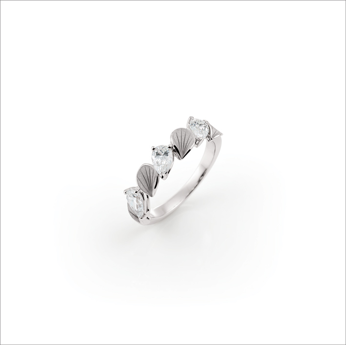 In questo dialogo di elementi preziosi, le superfici scolpite e i contrasti luminosi danno vita a un elegante gioco di luci e ombre che evoca lo scintillio dell’acqua in movimento. Ogni creazione riflette l’approccio scultoreo e contemporaneo del brand, trasformando una forma tradizionale della gioielleria in un’opera di design dal fascino senza tempo. Disponibile nella variante con diamanti da 0.20 carati o, per un effetto ancora più luminoso, nella versione da 0.30 carati.