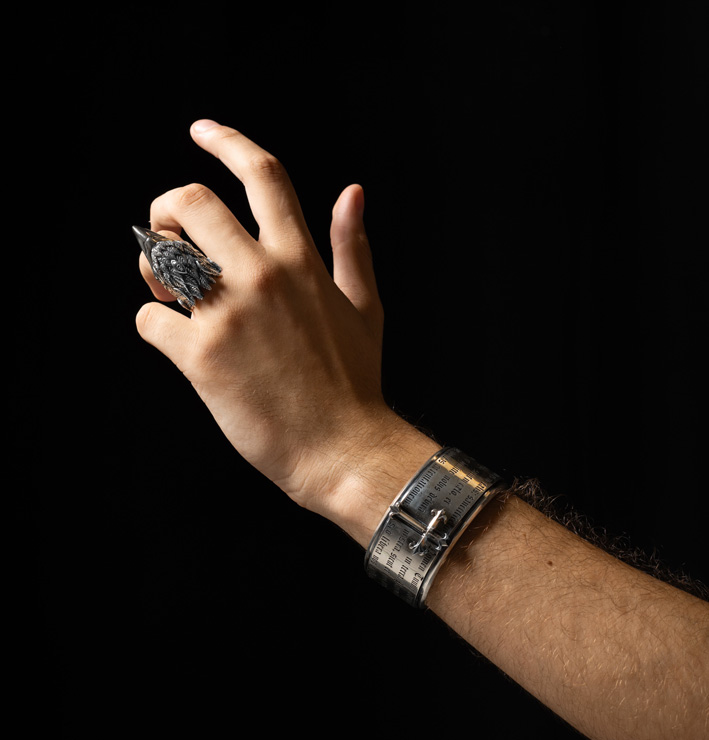 One example is the new Stella Crucis line, which plays on the motif of the cross as a universal symbol of spirituality. In addition to the cross, bracelets engraved with a Latin prayer are also available. Rings and pendants also draw on the iconography of votive offerings, with the depiction of rays converging toward a cross or a skull, in a blend of Gothic and Counter-Reformation influences. A concept that is anything but ephemeral.