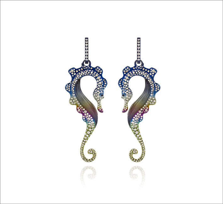 Otra tendencia, o truco, que los joyeros han estado adoptando durante algunos años es el titanio. Este metal altamente resistente y súper flexible se ha adoptado en joyería por sus cualidades específicas, a pesar de ser difícil de trabajar. Además de su resistencia, este metal también presume de la capacidad de ser coloreado, sin necesidad de un baño externo. Pero otra razón para usar titanio hoy en día es la posibilidad de usarlo como alternativa al oro. Es fácil imaginar que estas se presentan como consideraciones de diseño, que en realidad ocultan el deseo de evitar inflar excesivamente el precio de una pieza de joyería al evitar el uso de oro; su durabilidad será larga.