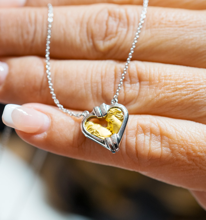 Autre bijou symbolique de la collection Infinito : une bague secrète : fermée, elle est en or et diamants, ornée d’un motif floral ; ouverte, elle révèle deux visages qui s’embrassent. La bague, inspirée de Roméo et Juliette, peut être portée de trois manières différentes.