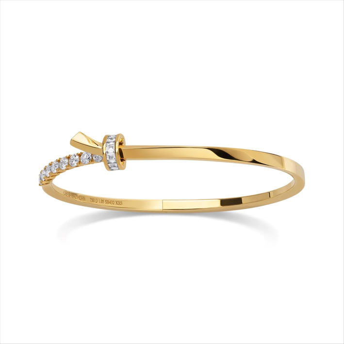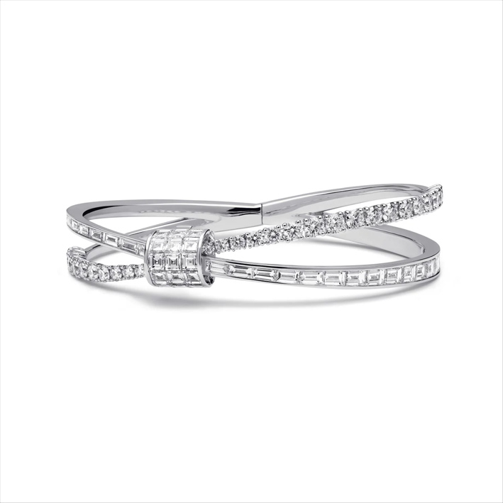 Les bijoux se caractérisent également par le jeu de deux tons métalliques distincts, l’or jaune et l’or blanc, qui symbolisent la dualité inhérente à chaque individu. La ligne de haute joaillerie, quant à elle, est en or blanc et fait la part belle aux diamants.