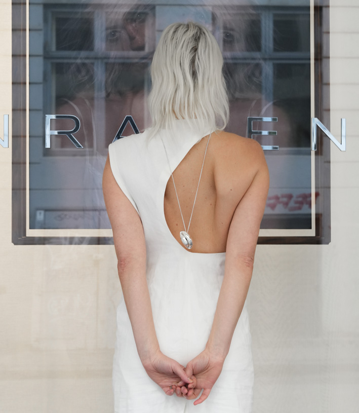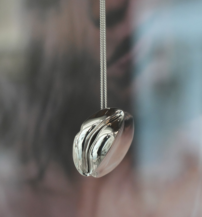 Le pendentif invite celle ou celui qui le porte à presser ses lèvres l’une contre l’autre pour partager un peu de soi, à la frontière entre une démonstration d’amour et une performance artistique, comme le suggère un film de Sarah Emilie Müllertz et Sophie Dupont. La marque danoise Kinraden tire son nom d’un ancien mot anglais signifiant parenté, reflétant la sagesse fondamentale selon laquelle nous sommes tous liés sur cette planète.
